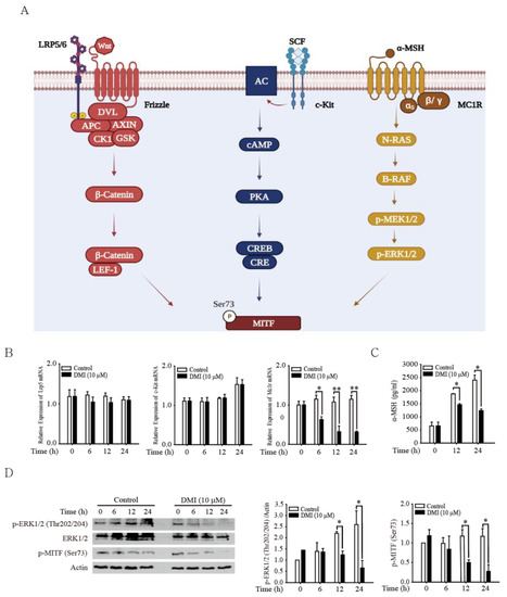3.4. DMI Inhibits the α-MSH/MC1R-ERK1/2-MITF Axis in B16F10 Cells