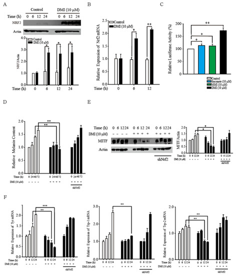 3.6. NRF2 Is Required for the Inhibition of Melanogenesis by DMI in B16F10 Cells