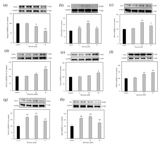 The antioxidant enzyme expression in ARE region due to pteryxin treatment for 24 h. In insulinoma MIN6 cells. (a) Keap1, (b) Nrf2, (c) HO-1, (d) GCLC, (e) Trxr1, (f) SOD1, (g) Bcl-xL, and (h) Akt. Data were expressed as mean ± SD, and the significant difference was analyzed by the student’s t-test. * p < 0.05 and ** p < 0.01 indicated as a significant difference from control.