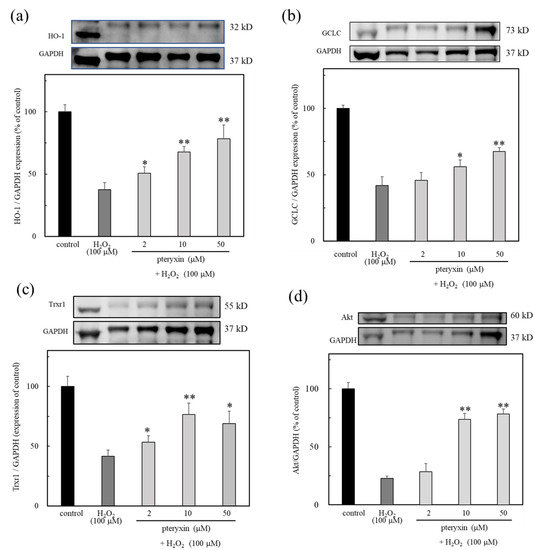 The antioxidant enzymes expression due to pteryxin under H2O2 treated cells for 24 hrs. The results showed that the expression of HO-1, GCLC, Trxr1, and Akt were expressed in the presence of pteryxin. (a) HO-1, (b) GCLC, (c) Trxr1, and (d) Akt. Data were expressed as mean ± SD, and the significant difference was analyzed by the student’s t-test. * p < 0.05 and ** p < 0.01 indicated as a significant difference from control H2O2 treated cells.