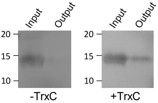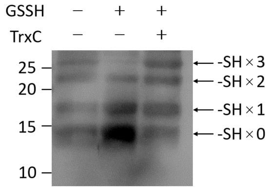 SqrR forms an intramolecular polysulfide crosslink between two cysteine residues following polysulfide exposure [10,11]. We, therefore, analyzed the role of TrxC in the reduction of the polysulfide crosslink in SqrR. Reduced SqrR was treated with a 50-fold molar excess of GSSH relative to the concentration of free protein subunit, and any remaining free thiol residues were modified by treatment with PEG-maleimide under anaerobic conditions. PEG-maleimide–modified SqrR species were separated by SDS-PAGE to identify completely reduced SqrR and crosslinked SqrR. As SqrR has three Cys residues (C9, C41, C107), four different bands were detected (Figure 2). In the case of reduced SqrR, a band derived from SqrR was detected in which the thiol group was completely reduced (top band). This top band disappeared after reduced SqrR was treated with GSSH, and the intensity of a band with two thiol groups protected from modification by PEG-maleimide (third band from the top) was increased instead, indicating the presence of an intracellular polysulfide crosslink between two thiols. In contrast, when GSSH-treated SqrR was incubated with reduced TrxC under anaerobic conditions, the intensity of the band derived from crosslinked SqrR decreased, and the band pattern was similar to that of reduced SqrR. These data suggest that TrxC reduces the polysulfide crosslink to thiol groups in SqrR.