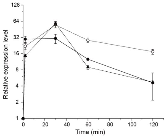 Responsiveness of SqrR regulated gene to sulfide. Temporal changes in the relative level of sqr gene transcripts after treatment with sulfide compared with 0 min in WT (filled circles), ΔtrxC (open circles), and trxC complementing strain (filled triangles) cells. Cells were cultured to the mid-log phase under aerobic conditions, and 0.2 mM sodium sulfide was added at t = 0. Cells were harvested at each time point and assayed by qRT-PCR. Data shown are mean ± S.E. from three biological replicates (error bars).