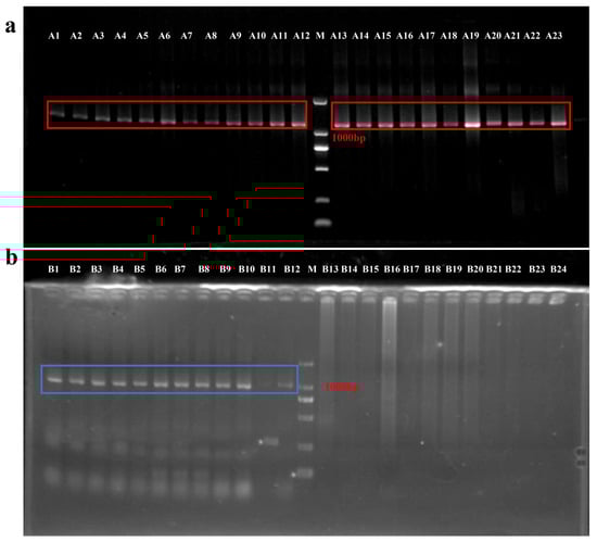 Detection of positive transfection rate in Nile tilapia in the analysis of liver tissue. M. marker. (a) PCR analysis of liver tissue from AGPAT2 knock-down group transfected with antisense RNA fragments. A distinct band at ~1100 bp (plasmid 1000 bp + antisense RNA fragment of ~100 bp) is visible. A1–A23 (red boxes) indicate 23 replicates from the AGPAT2 knock-down group. (b) B1–B12 (blue boxes) represent negative controls (n = 12 replicates) from which a 1000-bp band was amplified (plasmid 1000 bp). B13–B24 represent controls (n = 12 replicates) with no obvious band at 1000–1100 bp.