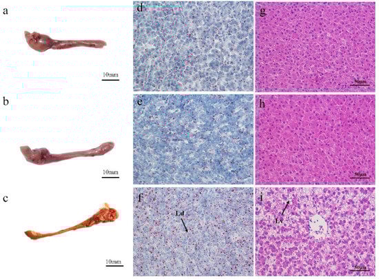 Effect of AGPAT2 knock-down on growth and structure of the liver in Nile tilapia. (a–c) Nile tilapia livers; (d–f) oil red O staining of liver tissues of Nile tilapia. Magnification 400×; (g–i) hematoxylin-eosin staining of liver tissues of Nile tilapia. (a,d,g) Control group; (b,e,h) negative control group; (c,f,i) AGPAT2 knock-down group. Ld: lipid droplet; Lv: lipid vacuole.