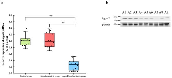 Downregulation of AGPAT2 transcript levels and AGPAT2 protein levels in Nile tilapia liver tissue by antisense RNA technology. (a) Transcript levels of AGPAT2 in liver tissues of the AGPAT2 knock-down, control, and negative control groups as determined by qRT-PCR (mean ± SE, n = 12 replicates per group). ** indicates significant difference (p < 0.05); (b) representative images of Western blots showing an abundance of AGPAT2 protein in liver tissues of the control and AGPAT2 knock-down groups: A1–A2, control; A3, negative control; A4–A9, AGPAT2 knock-down. The β-actin/β-actin was used as the reference gene transcript/protein.