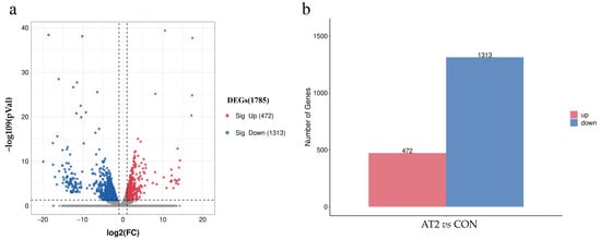 We detected significant DEGs in the livers between the AGPAT2 knock-down group and the control group using sequence data generated with the Illumina Novaseq 6000 platform. The number of clean reads in the libraries ranged from 37,271,364 to 495,433,150. The six libraries (CON 1–3, AT2 1–3) had Q20 values ranging from 99.75% to 99.95%, and GC content ranging from 45% to 47% (Table S1). These results confirm the reliability of the transcriptome sequencing analysis and the high quality of the sequencing data. A total of 22,283 genes were sequenced, of which 3437 were upregulated and 13,559 genes were downregulated. After applying the criteria for significant DEGs (|log2 fold change| ≥ 1 and p < 0.05), we detected 1785 DEGs, including house-keeping genes ldha, nono, arhgdia, and rpl11 that were significantly down-regulated. There were 472 upregulated genes and 1313 downregulated genes in the AGPAT2 knock-down group compared with the control group (Figure 4).