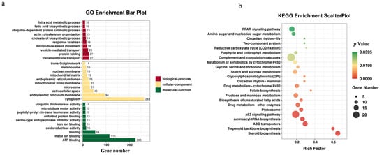 We used reads per kilobase per million reads (RPKM) values to measure the abundance of gene transcripts []. The DESeq2 R package (http://www.bioconductor.org/packages/release/bioc/html/DESeq2.html accessed on 5 September 2021) was used to detect significantly differentially expressed genes (DEGs) between the control group and the AGPAT2 knock-down group, with the criteria |log2 fold change| ≥ 1 and p < 0.05 []. All the DEGs were subjected to Gene Ontology (GO) and Kyoto Encyclopedia of Genes and Genomes (KEGG) analyses to determine their potential functions and related metabolic pathways.