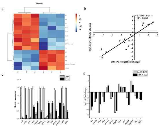 Three fish samples from the AGPAT2 knock-down group and control group were combined to construct each sequencing library. This was repeated three times for each group. To establish an independent sequence library, the Nile tilapia AGPAT2 knock-down group and the control group were analyzed. We constructed three control (CON 1–3) and three AGPAT2 knock-down (AT2 1–3) libraries. The libraries were sequenced using an Illumina Novaseq™ 6000 instrument (LC-Bio Technology Co., Ltd., Hangzhou, China) in PE150 sequencing mode, following standard protocols.