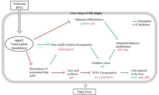 We report the application of antisense RNA technology to create an animal gene defect model, i.e., a Nile tilapia liver response model based on AGPAT2 knock-down (Figure 7). During the early development of Nile tilapia, the transcription of AGPAT2 is inhibited, so the transcript levels of AGPAT2 and the abundance of AGPAT2 protein are significantly downregulated. This leads to inhibition of growth and development, increases in serum lipid metabolism indexes and blood glucose levels, and ultimately, insulin resistance. The liver accumulates lipids, its cells become vacuolated, and the activity of liver antioxidant enzymes increases. The knock-down of AGPAT2 leads to abnormalities in the PPAR signaling pathway, biosynthesis of unsaturated fatty acids, and the p53 signaling pathway, leading to oxidative stress and changes in the regulation of lipid metabolism.