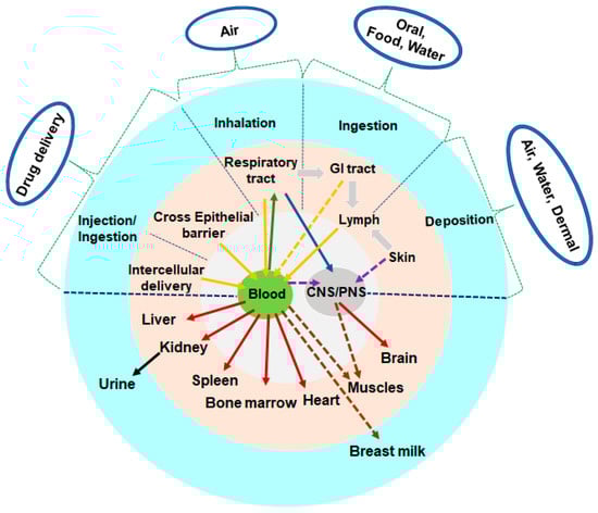 Despite the undeniable benefits of nanoscale materials’ potency, there are questions which still need to be solved regarding how NPs are implemented in everyday life and may or may not impact the environment. The direct and indirect effects of mNPs on the environment and air pollution may be researched from various perspectives. It may inevitably enter the environment by producing, using, and discarding nanoparticle products. These mNPs may accumulate at a certain “level to environmental risk assessment” that necessitates an understanding of the relationship due to their propensity to aggregate, agglomerate, and maybe adsorb or interact with biological matter. As a result, living creatures are constantly exposed to inorganic NPs, which enter the human body through various paths such as ingestion, inhalation, dermal penetration, and blood circulation [7] and are translocated in organs (liver, kidneys, spleen, heart, and brain) and tissues, depending on their physicochemical properties (Figure 1). To assess the threat of inorganic NPs, it will be crucial to comprehend the precise mechanism underlying their cell-specific cytotoxicity and the validity of toxicity analytical techniques.