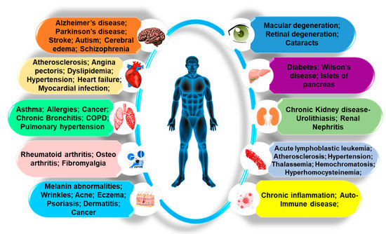 Throughout the twenty-first century, revolutionary nanotechnology has been rapidly expanding and intriguing scientists, medical professionals, and consumers [1,2]. Material nanoparticles (NPs) have distinct physicochemical qualities due to their nano-size (<100 nm), wide surface area, and rapid reactivity. Nevertheless, more than ~2800 commercial nanoparticulate-based applications are promptly available [3]. These NPs exhibit specific physicochemical characteristics and are manufactured for applications in biological and commercial functions, including cancer research [4], drug delivery, cosmetics, biosensors, environmental remediation, antimicrobial agents, and environmental remediation [5]. The population susceptible to metal-based nanoparticles (mNPs) is growing as their application develops. According to the allied market report (https://www.alliedmarketresearch.com/nanotechnology-market, published in July 2021), the worldwide nanotechnology market was valued at USD 1055.1 million in 2018 and is estimated to reach USD 2231.4 million by 2025, with a total value of USD 43.1 billion by 2030 with a CAGR of 18.05% from 2022 to 2030. However, with the fast growth of nanotechnology and the widespread usage of nano products, the hazard of human exposure is rapidly increasing [6]. mNPs are frequently consumed through food, drink, air, cosmetics, or pharmaceuticals and absorbed by the body before being redistributed to major organs, potentially causing tissue damage.