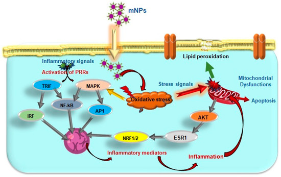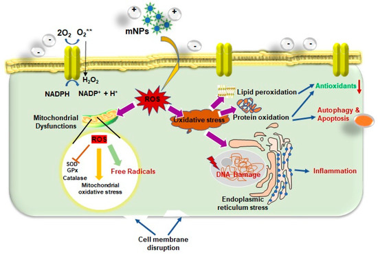 The mNPs could function as oxidants and frequently cause oxidative stress in biological systems. These mNPs can drive redox processes, which results in endogenous ROS production, leading to cause serious health hazards such as even genotoxicity. Several redox signaling pathways in cells are made up of signaling molecules like kinases and transcription factors that are negatively controlled by sensor proteins. According to conventional understanding, oxidative stress can trigger such cellular signaling by changing sensor protein thiol groups [151]. Due to their high surface-to-volume ratio, NP is reactive and susceptible to environmental stressors. After exposure to mNPs, alveolar macrophages (AM) and neutrophils triggered oxidative stress in the lungs. The immune system’s phagocytic cells, such as neutrophils, activate NADPH oxidase to produce ROS [152].