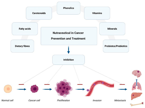 Figure 2. Schematic illustration of various kinds of nutraceuticals used in cancer prevention and treatment (Created with “https://www.biorender.com (accessed on 12 December 2022)”.