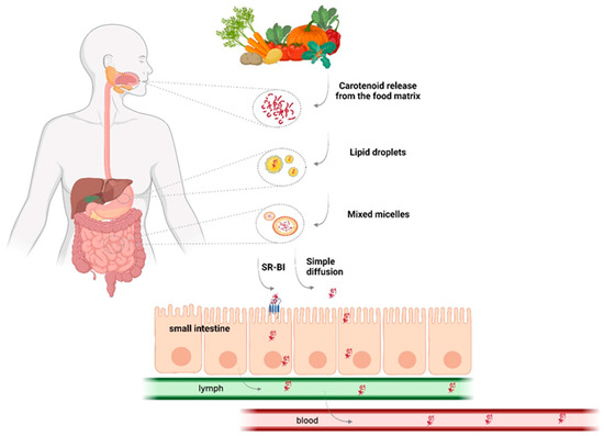 Figure 4. Schematic representation of the absorption of carotenoids (Created with “https://www.biorender.com (accessed on 12 December 2022)”.