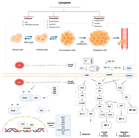 Natural carotenoids display strong antioxidant capacity [26]. Lycopene and its metabolites block the “initiation” phase by neutralizing reactive oxygen species (ROS) by activating detoxification systems and the expression of antioxidant enzymes, thereby protecting cells from damage caused by carcinogenic substances. Lycopene can also block or prevent tumor promotion and progression by modulating inflammatory cytokines and growth factor pathways (Figure 5).