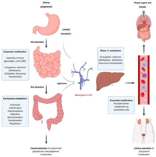 Figure 6. Schematic representation of the absorption and metabolism of food polyphenols (Created with “https://www.biorender.com (accessed on 12 December 2022)”.