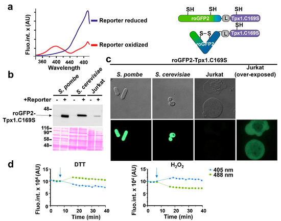 As described in the Introduction, we recently designed an H2O2 biosensor, roGFP2-Tpx1.C169S, and expressed it in fission yeast cells [27] (Figure 1a). As with all the roGFP derivatives, it displays two excitation maxima, which change with H2O2-dependent cysteine oxidation, and one emission wavelength, and this allows a concentration-independent, ratiometric quantification of probe oxidation. We generated plasmids to express the reporter in budding yeast and Jurkat cells, under the control of the constitutive nop1 and MCV promoters, respectively. The relative concentrations of the probe in the three model systems were determined by Western blot analysis (Figure 1b) and fluorescence microscopy (Figure 1c). The concentration of roGFP2-Tpx1.C169S was higher in fission yeast than in S. cerevisiae or Jurkat cells, using anti-GFP antibodies. As explained above, concentration should not affect the interpretation of the results.