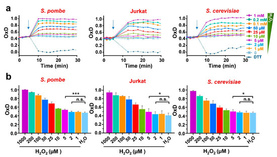 H2O2-dependent oxidation of roGFP2-Tpx1.C169S expressed in S. pombe, Jurkat T cells, and S. cerevisiae. Wild-type of S. pombe (HM123), S. cerevisiae (BY4741), or Jurkat T cells, transformed with p407.C169S, p791, or p797 to express roGFP2-Tpx1.C169S, were grown in their own media (MM-, SD-, or RPMI 1640-supplemented), centrifuged and resuspended in MM (both yeasts) or ISO (Jurkat) for a final OD600 of 1 (both yeasts) or 0.5 (Jurkat cells). Then, 190 µL of these cell suspensions were plated in 96-well imaging plates, and incubation and fluorescence recording were initiated at 37 °C with 100 rpm shaking. After 4 cycles, the indicated treatments of DTT or H2O2 were applied (indicated with arrows). The degree of probe oxidation, or OxD (amount of probe oxidation per 1), is indicated over time. (b) Bar graphs represent the average of 3 OxD values from the 12 to 17 min time points for each treatment and cell type represented in (a). Statistical significance was calculated between the indicated samples with a ratio paired Student’s t-test with p-values of 0.05 (*) and 0.001 (***); n.s., non-significant. For each strain, average data from four biological replicates are shown, with error bars (S.D.) of (a) displayed in Figure S1.