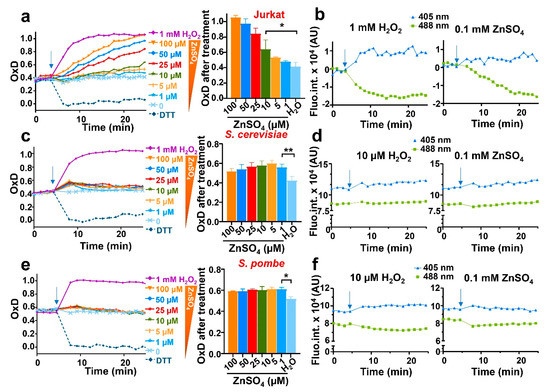 The addition of extracellular zinc causes intracellular bursts of H2O2 in the three eukaryotic models. Cell suspensions of Jurkat T cells (a,b), BY4741 (S. cerevisiae) (c,d), or HM123 (S. pombe) (e,f) expressing roGFP2-Tpx1.C169S were treated with 1 mM of H2O2 (as a control) or with the indicated concentrations of ZnSO4, ranging from 1 to 100 µM. Probe oxidation was determined as in Figure 2. (a) Jurkat experiments were performed as previously described at 37 °C with 100 rpm shaking. The middle panel (bar graph) represents the OxD at min 25. (b) Graphs showing the time-dependent (X-axis) emission fluorescence (Y-axis, fluorescence arbitrary units, AU) of the reporter in Jurkat upon excitation at 405 or 488 nm. (c–f) Yeast experiments were performed at 30 °C and 700 rpm shaking. The middle panel (bar graph) represents the OxD at the first time point after treatment. (d,f) Graphs showing the time-dependent (X-axis) emission fluorescence (Y-axis, fluorescence arbitrary units, AU) of the reporter in yeasts upon excitation at 405 or 488 nm. In all graphs, the time of addition is indicated with arrows. Statistical significance was calculated with a ratio paired Student’s t-test between pointed-out samples with p-values of 0.05 (*) and 0.01 (**). For each strain, average data from three biological replicates are shown, with error bars (S.D.) of left panels (a,c,e) displayed in Figure S2.