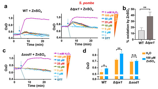 We decided to continue studying the generation of H2O2 from added zinc using fission yeast, for which we have a vast collection of strains of known impact on peroxide homeostasis. Thus, we applied various concentrations of the metal to cells lacking the main H2O2 scavenger Tpx1. We had shown before that roGFP2-Tpx1.C169S expressed in Δtpx1 is able to sense concentrations of peroxides lower than in a wild-type background since H2O2 is not scavenged, and the basal level of oxidation of the probe, OxD0, is also significantly altered (20% more oxidized than in wild-type cells) [27]. As shown in Figure 4a,b and Figure S3, the oxidation of the sensor upon the addition of micromolar zinc was quantitatively larger than that observed in a wild-type background, confirming that H2O2 had been intracellularly generated as a secondary event upon zinc supplementation.