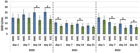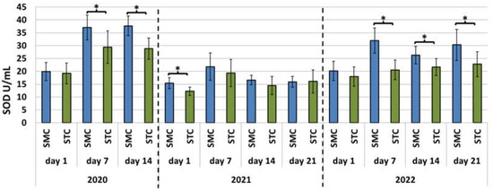 Laboratory experiment—Superoxide dismutase (SOD) activities in the hemolymph of workers in three consecutive years. SMC—workers reared in small-cell combs; STC—workers reared in standard-cell combs; *—differences between the SMC and STC workers within the age group are significant at p ≤ 0.05; vertical bars indicate standard deviation.