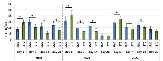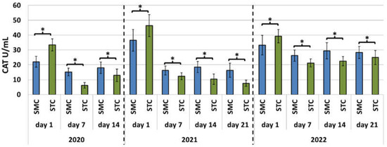 Laboratory experiment—Catalase (CAT) activities in the hemolymph of workers in three consecutive years. SMC—workers reared in small-cell combs; STC—workers reared in standard-cell combs; *—differences between the SMC and STC workers within the age group are significant at p ≤ 0.05; vertical bars indicate standard deviation.