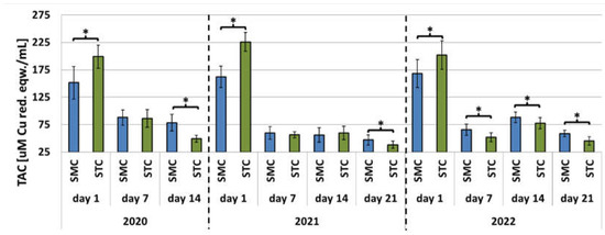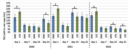 Apiary experiment—Total antioxidant capacity (TAC) levels in the hemolymph of workers in three consecutive years. SMC—workers reared in small-cell combs; STC—workers reared in standard-cell combs; *—differences between the SMC and STC workers within the age group are significant at p ≤ 0.05; vertical bars indicate standard deviation.