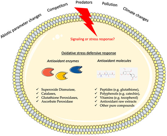 As a result of changes in environmental conditions, pollution, climate changes and interactions with other species, marine organisms are continuously exposed to oxidative stress [16,17]. Oxidative stress can be considered an imbalance between the generation of free radicals, such as reactive oxygen species (ROS), and the antioxidant defense system of an organism [18]. Examples of ROS are superoxide anion (O2−), hydrogen peroxide (H2O2) and hydroxyl radical (HO•) [19]. In general, ROS, at low concentrations, have been reported to have important roles in stress perception, pathogen recognition, programmed cell death and others [20], but when produced at high concentrations, are known to induce damages to nucleic acids, proteins, lipids and carbohydrates [17], inducing enzyme denaturation, lipid peroxidation and blockage of various cellular functions [21]. However, elevated ROS have been also reported as signaling compounds in order to maintain/regulate physiological activities [22]. How do marine organisms respond to ROS stress induction? Cells have the possibility of activating a series of defense strategies, which include both the activation of antioxidant enzymes and the production of antioxidant molecules, known as enzymatic and non-enzymatic defense mechanisms (Figure 1) [21].