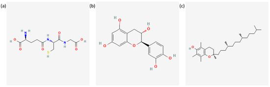 Antioxidant scavenger molecules: (a) glutathione [33], (b) catechin [34], (c) vitamin E [35]. Chemical structures are retrieved from the database PubChem (https://pubchem.ncbi.nlm.nih.gov/; accessed on 21 January 2023).