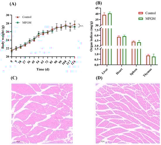 Effects of milk fat globule membrane on body weight, organ indices, and muscle tissue: (A) body weight of mice in different groups over 18 weeks; (B) organ indices of mice in different groups at 18 weeks; (C) the structure of gastrocnemius in the Control group; and (D) the structure of gastrocnemius in the MFGM group. The data are expressed as mean ± SD, n = 8, n.s.: no significance. Control: fed with saline; MFGM: fed with 400 mg/kg BW milk fat globule membrane.