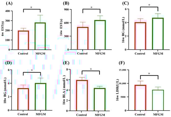 Effects of milk fat globule membrane on the swimming test and biochemical indices in blood serum: (A) exhaustive swimming time (EST) of the mice in different groups at 6 weeks; (B) exhaustive swimming time (EST) of the mice in different groups at 14 weeks; (C) content of blood glucose (BG) from the mice in different groups after the free swimming test at 16 weeks; (D) content of blood glucose (BG) from the mice in different groups at 18 weeks; (E) content of blood lactic acid (BLA) from the mice in different groups after the free swimming test at 16 weeks; and (F) content of lactate dehydrogenase (LDH) from the mice in different groups after the free swimming test at 16 weeks. The data are expressed as mean ± SD, n = 8, * p < 0.05. Control: fed with saline; MFGM: fed with 400 mg/kg BW milk fat globule membrane.