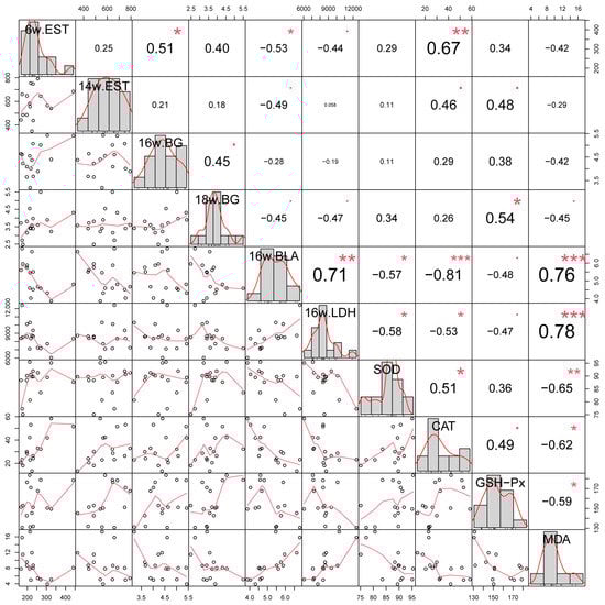 Pearson correlation analysis of different indicators of mice. 6w. EST: exhaustive swimming time at 6 weeks; 14w. EST: exhaustive swimming time at 14 weeks; 16w. BG: blood glucose after free swimming test at 16 weeks; 18w. BG: blood glucose at 18 weeks; 16w. LDH: lactate dehydrogenase after free swimming test at 16 weeks; SOD: superoxide dismutase at 18 weeks; CAT: catalase at 18 weeks; GSH-Px: glutathione peroxidase at 18 weeks; and MDA: malondialdehyde at 18 weeks. All biochemical indices are measured from blood serum. The red line at the bottom half of the plot is the fitted curve. The red line in the diagonal of the plot is the probability density function. Significant correlations are indicated by * p < 0.05, ** p < 0.01, and *** p < 0.001.