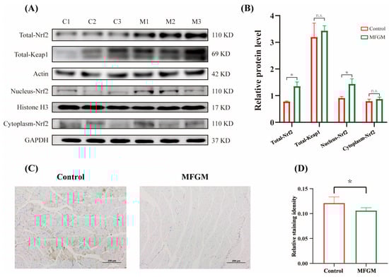 Effects of milk fat globule membrane on protein expressions in the muscle and liver of the mice at 18 weeks: (A) Western blot of nuclear and cytoplasmic nuclear factor erythroid 2-related factor 2 (Nrf2) and total Kelch-like ECH-associated protein 1 (Keap1); (B) quantification analysis of total Nrf2, total Keap1, nucleus-Nrf2, and cytoplasm-Nrf2; (C) immunohistochemical analysis of gastrocnemius muscle in the Control and MFGM groups; and (D) average optical density of Caspase-3 in the two groups. C1, C2, and C3 belong to the Control group, whereas M1, M2, and M3 belong to the MFGM group. The data are expressed as mean ± SD, n = 3, * p < 0.05, n.s.: no significance. Control: fed with saline; MFGM: fed with 400 mg/kg BW milk fat globule membrane.