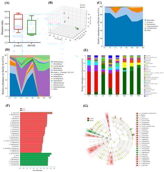 Effects of milk fat globule membrane on intestinal flora at 18 weeks: (A) Alpha-diversity was assessed by calculating the Shannon index; (B) beta-diversity was assessed using principal component analysis; (C) effects of milk fat globule membrane on the composition of gut microbiota in the mice (Phylum level); (D) effects of milk fat globule membrane on the composition of gut microbiota in the mice (Family level); (E) effects of milk fat globule membrane on the composition of gut microbiota in the mice (Genus level); (F) results of linear discriminative analysis (LDA); and (G) effect size (LefSe) analysis between the two groups. Cardiogram showing differentially abundant taxonomic clades with an LDA score of 3.0 among groups with a p-value of 0.05; C1, C2, C3, and C4 belong to the Control group, whereas M1, M2, M3, and M4 belong to the MFGM group. Control: fed with saline; MFGM: fed with 400 mg/kg BW milk fat globule membrane.