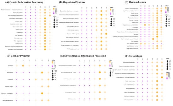 The predicted functional differences based on the KEGG (Kyoto Encyclopedia of Genes and Genomes) of the metabolic pathways of the gut microbiota at 18 weeks: (A) Genetic Information Processing; (B) Organismal Systems; (C) Human Diseases; (D) Cellular Processes; (E) Environmental Information Processing; and (F) Metabolism. C1, C2, and C3 belong to the Control group, whereas M1, M2, and M3 belong to the MFGM group. Control: fed with saline; MFGM: fed with 400 mg/kg BW milk fat globule membrane.