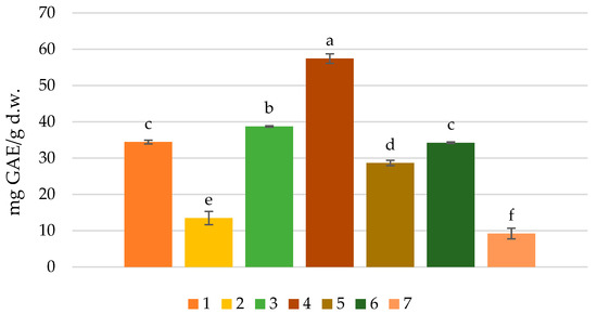 Total phenolic content of the analyzed cocoas as analyzed by Folin–Ciocalteu. Different letters indicate significant differences. Numbers 1–7 correspond to the cocoa samples.