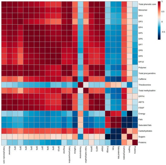 Pearson correlations heatmap of the cocoa powders’ analyses and nutritional facts. DP, degree of polymerization.