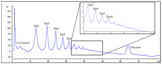 Table 3 summarizes the total procyanidin content of the cocoa powders, according to their degree of polymerization (DP) as analyzed by HPLC-FLD. In addition, a representative chromatogram of the procyanidin distribution is depicted in Figure 3.