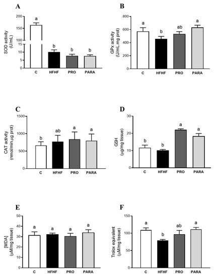 | Liver TG (mg/g tissue) | 42.7 ± 1.7 c | 130.5 ± 4.6 a | 108.2 ± 4.4 b | 119.4 ± 4.6 ab | p < 0.05 |