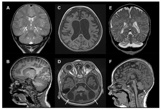 Neuroimaging in COQ4 deficiency: (A) Brain MRI, T2-weighted, coronal images of a 15-month-old girl with COQ4 deficiency. Images show bilateral circumscribed lesions in the subthalamic nuclei (white arrows). (B) Sagittal T1-weithed MRI images show no cerebellar lesions. (C) Brain MRI, T1-weighted, axial images of an 18-month-old girl with COQ4 deficiency showing global brain atrophy. (D) Brain MRI, T1-weighted, axial images of the same child showing cerebellar degeneration with bilateral large cysts within the cerebellar hemispheres (white arrows). (E,F) T2-weighted, coronal and sagittal images and of a 2-month-old girl with COQ4 deficiency showing cerebellar hypoplasia (white arrow). Other MRI images of these individuals were published previously [30].