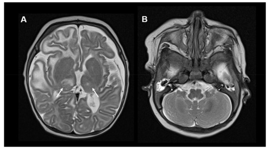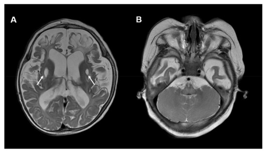 In 2017, a patient of Wang et al. whose neurological development delay became noticeable in the second year of life had serial normal MRI scans of the brain and spine [39]. A second patient was described in 2022 by Wang et al. with global developmental delay at 15 months of age. The brain MRI showed hyperintensities in the supratentorial bilateral periventricular white matter on T2-weighted and FLAIR imaging [40].