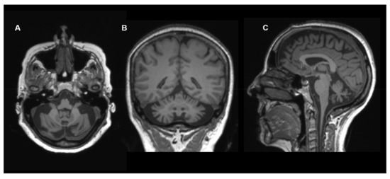Neuroimaging in COQ8A deficiency: Brain MRI (T1-weighted images, (A) axial view; (B) coronal view; (C) sagittal view) of a 60-year-old female with COQ8A deficiency. Images show cerebellar atrophy. Other MRI images of this individual were published previously [45].