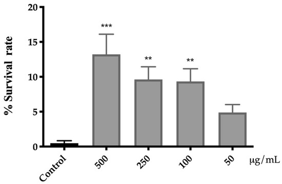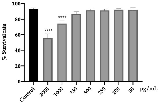 Initially, the effect of the extract on the viability of C. elegans N2 was carried out to evaluate its acute toxicity and to establish the range of non-toxic concentrations (Figure 1).