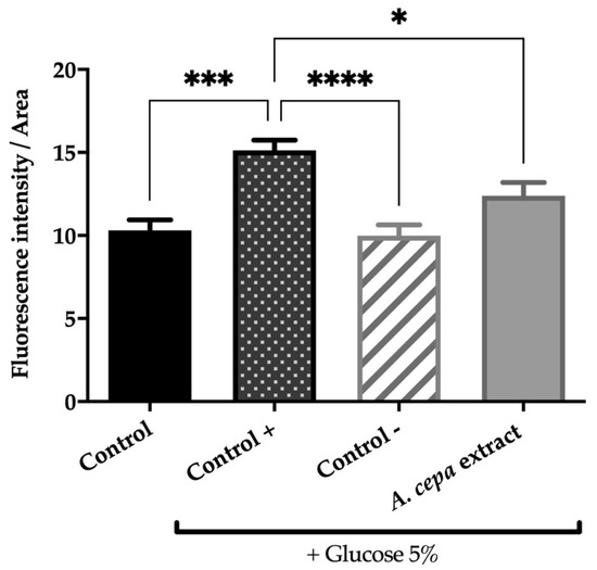 Effect of the extract from fresh flowers of A. cepa on C. elegans N2 total fat. Control group was nematodes without supplementation of glucose, while A. cepa extract (250 µg/mL), control + (orlistat, 6 µg/mL) and control groups were cultivated in the presence of 5% glucose. Results are represented as mean ± SEM (n = 50–60 worms). Differences were considered significant at p ≤ 0.05 (*), p < 0.001 (***) and p < 0.0001 (****).
