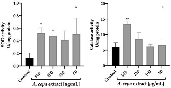 The effect of A. cepa extract on SOD and CAT activities was determined on C. elegans (Figure 4). After 48 h of treatment with the extract, the results revealed a significant increase in the activity of both enzymes with respect to the control group. The best response was found in the group treated with 500 µg/mL leading to a 4.3 and 2.3-fold increment for SOD and CAT activity compared to the control worms, respectively. The 250 µg/mL group also increased SOD activity (3.8-fold) without having a significant effect on the CAT activity against the control group.