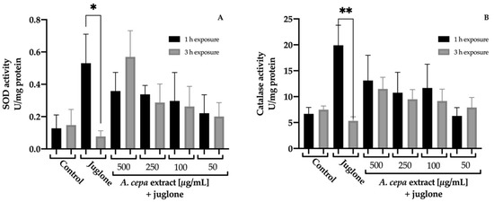 Effect of A. cepa flower extract on SOD (A) and CAT (B) activity after sublethal oxidative stress induced by exposure C. elegans to juglone for 1 o 3 h. Results are represented as mean ± SEM. Differences were considered significant at p ≤ 0.05 (*) and p < 0.01 (**).