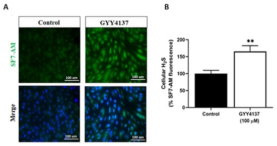 To test the ability of GYY4137 (100 µM) to increase intracellular H2S levels in our model, cells were stained with H2S-interacting dye, SF-7AM. As shown in Figure 1A,B, fluorescence staining confirmed that GYY4137 (100 µM) enhanced the intracellular H2S level in HUVECs (p < 0.005) without toxicity as demonstrated by mitochondrial superoxide production (Supplementary Figure S2).
