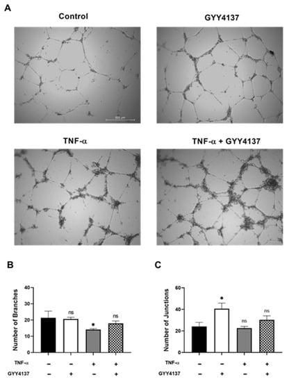 Effects of GYY4137 in endothelial angiogenesis. HUVECs were treated with TNF-α (1 ng/mL, 3 h) followed by GYY4137 (100 μM, 21 h). (A) Representative images of vessel formation by HUVECs. A Nikon microscope captured images using 4× objective magnification (scale bar: 500 μm). (B) The number of branches and (C) the number of junctions was analysed by ImageJ software. Results were shown as mean ± SD, 3 independent experiments with 3 replicate in each experiment. Significance was determined by a one-way ANOVA test followed by Tukey’s post-test comparing treatments to control. ns. (non-significant), * p < 0.05 compared to control.