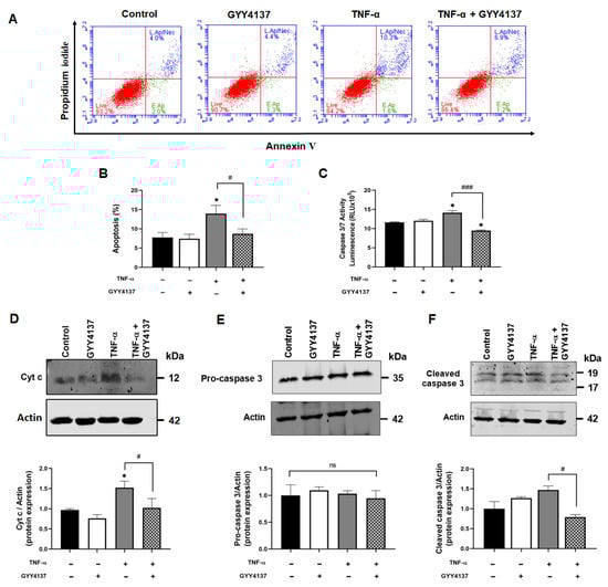 Next, the role of GYY4137 on apoptosis in TNF-α-stimulated HUVECs was investigated. Annexin V/PI-positive staining showed increased cell apoptosis in the presence of TNF-α compared to the control (p < 0.05). GYY4137 post-TNF-α treatment significantly decreased apoptosis in TNF-α-treated HUVECs (p < 0.05) (Figure 3A,B) and decreased IL-6 release (Supplementary Figure S4). To investigate whether these protective effects occur via the intrinsic apoptotic pathway, Cyto c release and downstream caspase activity were analysed. Figure 3C shows that TNF-α significantly increased caspase 3/7 activity compared to untreated cells (p < 0.05). Post-treatment with GYY4137 significantly reduced caspase activity in TNF-α-treated cells (p < 0.001). As shown in Figure 3D, TNF-α treatment increased the expression of cytosolic Cyto c (p < 0.05), whilst GYY4137 post-treatment reduced Cyto c release in TNF-α-treated cells (p < 0.05). To further analyse the downstream cascade signalling regulated by TNF-α, protein expression of pro-caspase 3 and cleaved caspase 3 were tested by immunoblotting. However, the levels of caspase 3 were not different between the groups (Figure 3E). On the other hand, cleaved caspase 3 protein expression was increased in the presence of TNF-α, which was significantly decreased with GYY4137 post-treatment (Figure 3F). These results suggested that GYY4137 may attenuate apoptosis via an intrinsic caspase-dependent pathway.