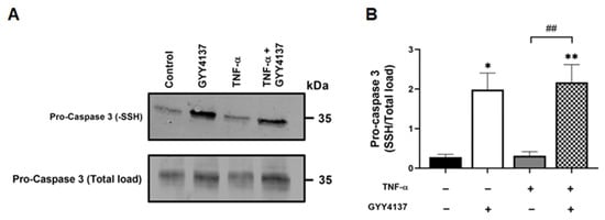 Recent reports suggest protein S-sulfhydration may modulate the apoptotic pathway []. To investigate whether the reduction in apoptosis and caspase 3/7 activation by GYY4137 was associated with S-sulfhydration, protein levels of sulfhydrated caspase 3 were investigated (Figure 4A). GYY4137 increases total S-sulfhydration proteins in endothelial cells (Supplementary Figure S5). S-sulfhydrated pro-caspase 3 protein levels were significantly increased in those cells exposed to GYY4137 post-treatment in the presence (p < 0.01) or absence of TNF-α (p < 0.05) compared to untreated cells (Figure 4B). TNF-α alone did not alter pro-caspase sulfhydration, but a significant increase in sulfhydrated pro-caspase 3 protein expression upon GYY4137 treatment (p = 0.01) was observed. These results suggest that GYY4137 may enhance the S-sulfhydration of proteins, including caspase 3, irrespectively of the pro-inflammatory status.